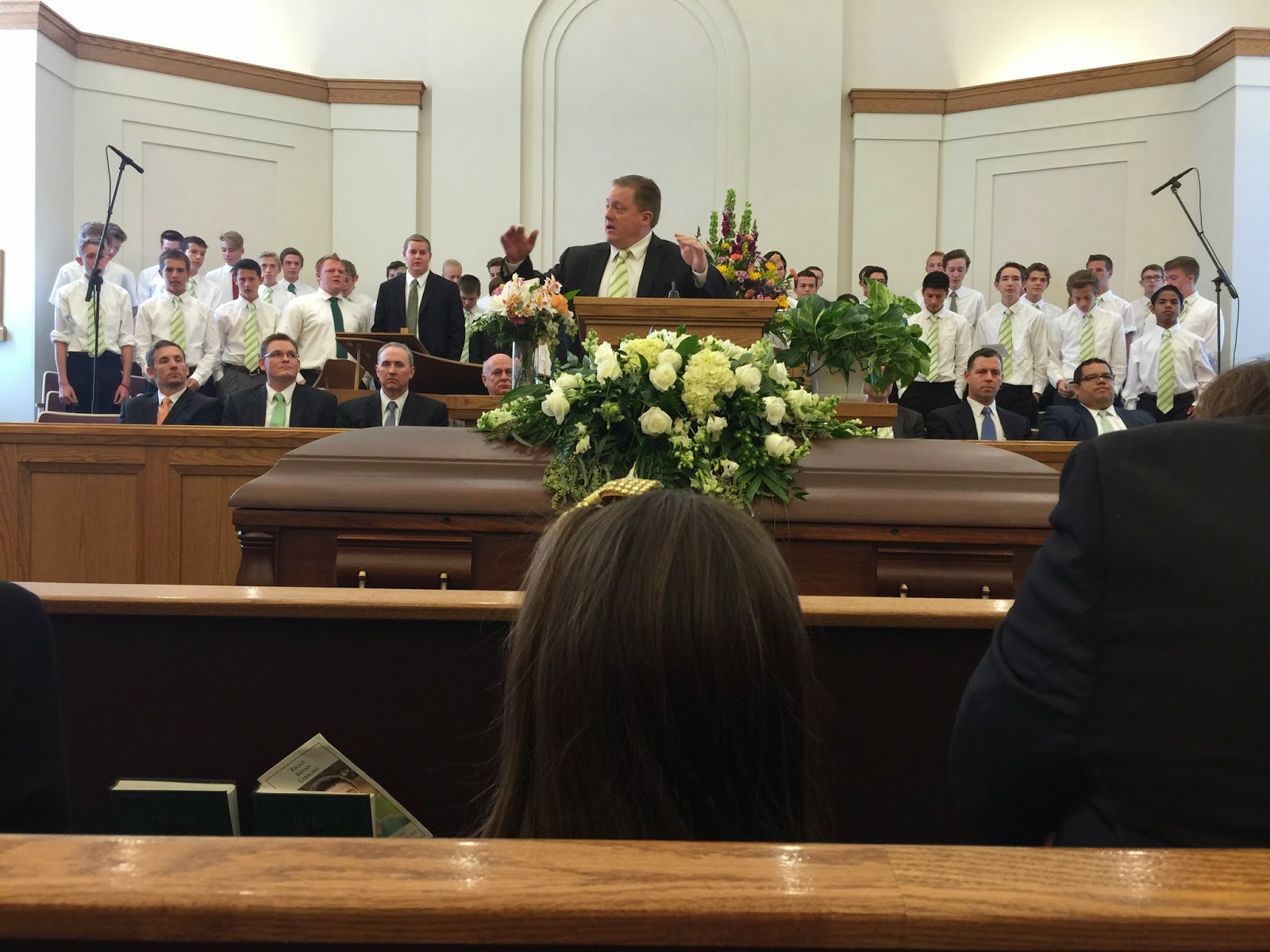 The funeral the next morning was perfect. The music was the most beautiful music, perfect songs, etc. Russ did a great job reading the life sketch. The other speaker also did a wonderful job. Even Bryan, Auburn, Jax, and Roxy stood up and shared their thoughts about Riggs, and did a great job. I had to sneak a few pictures during the musical numbers because it was the coolest sight to see Riggs's friends up there in their green ties.
